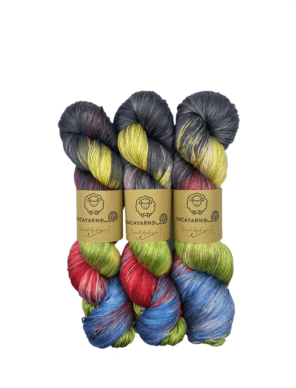 - Madeja multicolor: Seda, grosor Fingering, 100 g/400 m, 100% seda mulberry, de ENCAYARNS. Color: Tucán.